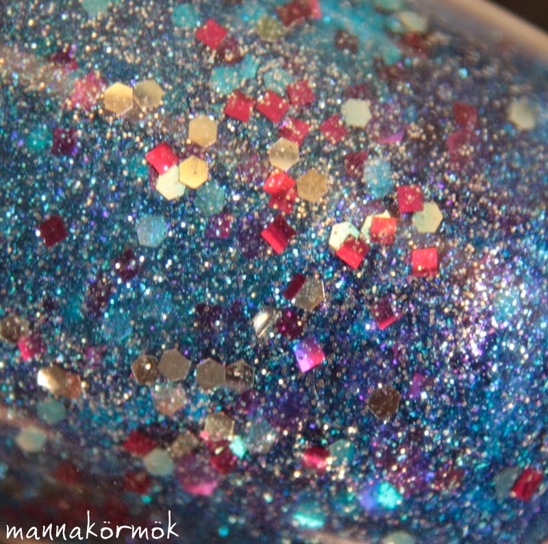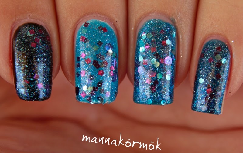 Az Nr. 2-es szintén ilyen apró pelyhecskés, zselés, kék alapszínű lakk, amiben ezüst hexagon és piros négyszögű glitterek úszkálnak, na meg tele van aprópici ezüst és kék mikrocsillámmal. Szintén fekete, fehér és kék alapra próbáltam és a másik társához hasonlóan ő is jól fed már 3 réteg használata után is akár.