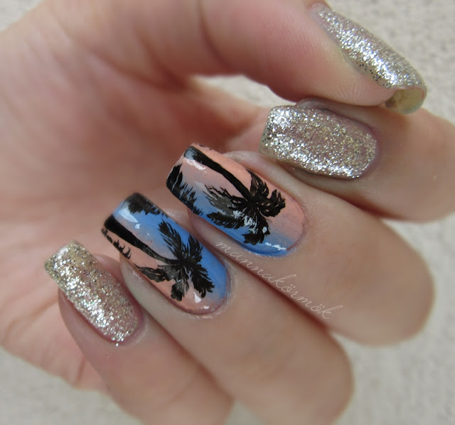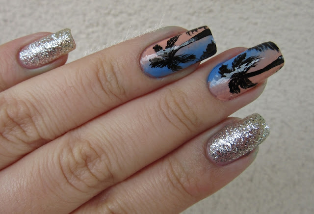 Az átmenetet két körmömre készítettem el, barack-kékes kombinációban. Erre kerültek az akrillal festett pálmafák. A többi körmöm ezüst glitteres alapot kapott. A bejegyzés végén egy videót is láthattok a köröm elkészítéséről. :)