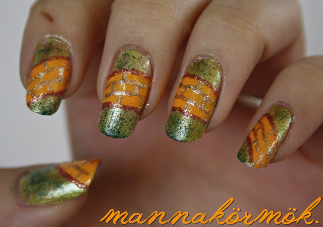 Alapnak a Farmasi 88-es zöld lakkját használtam, erre szivacsos technikával az Aden méregzöld lakkját vittem fel. A sárga utat az Essence lakkjával festettem meg, a szélére a vonalat és a "téglákat" pedig Aden lakkal húztam. :)